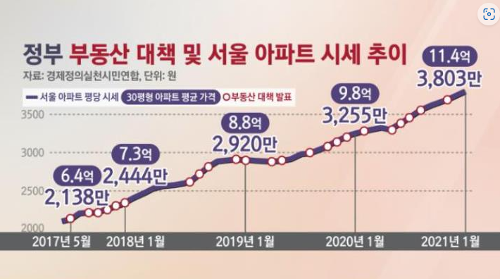 아래의 자료에 따르면, 문재인 정부는 2017년부터 2021년까지 총 26회의 부동산 대책을 발표했지만, 서울 아파트 가격은 오히려 약 78% 상승했다.