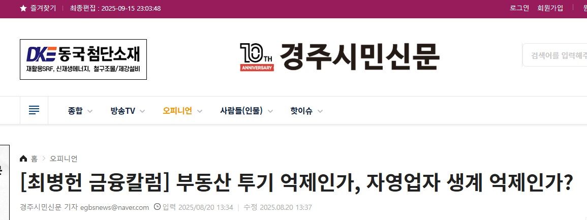 [경주시민신문] [최병헌 금융칼럼] 부동산 투기 억제인가, 자영업자 생계 억제인가?